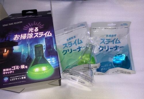キーボード清掃用にインテリアにもなるというスライムクリーナーを購入してみました。 実際に使ってみて 内容物 内容物は、スライムを入れるフラスコとスライムのグリーンとブルーの2色、そしてフラスコの底を照らすLEDユニットが入っておりました。スライム…