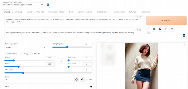 ポーズや着用している服装なんかも入れていかないと、素っ裸か下着姿の女性が生成されるので、ご注意です。